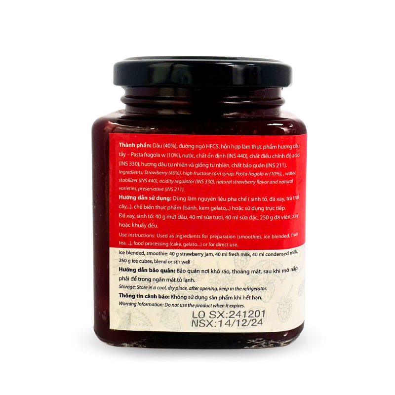 Thành phần: Dâu tươi (40%), đường ngô HFCS, hỗn hợp làm thực phẩm hương dâu tây – Pasta fragola w (10%), nước, chất ổn định (INS 440), chất điều chỉnh độ acid (INS 330), hương dâu tự nhiên và giống tự nhiên, chất bảo quản (INS 211)