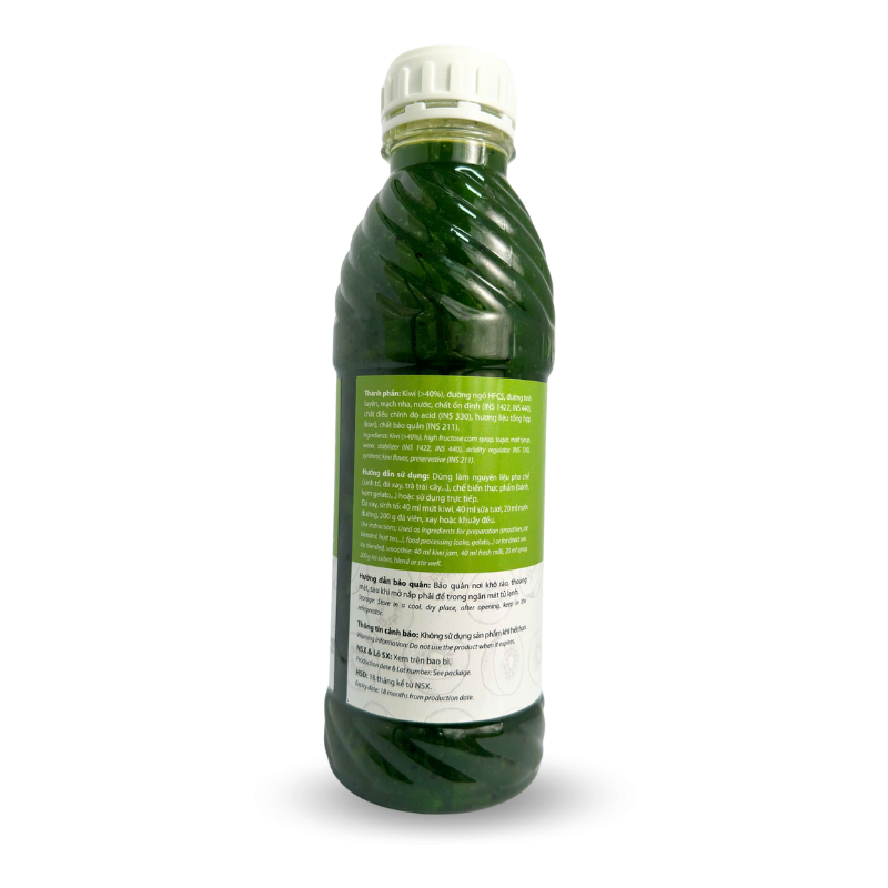 Kiwi (≥40%), đường ngô HFCS, đường tinh luyện, mạch nha, nước, chất ổn định (INS 1422, INS 440), chất điều chỉnh độ acid (INS 330), hương liệu tổng hợp, chất bảo quản (INS 211) -