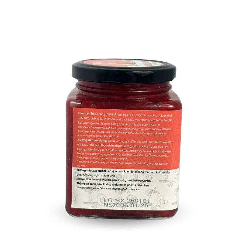 • Thành phần: Ổi hồng (≥60%), đường ngô HFCS, mạch nha, nước, chất ổn định (INS 440), chất điều chỉnh độ acid (INS 330), màu thực phẩm tự nhiên (INS 120), hương ổi tự nhiên và giống tự nhiên, màu thực phẩm tổng hợp, chất bảo quản (INS 211)