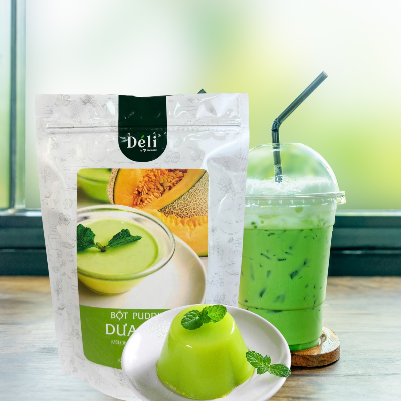 Pudding Dưa Lưới Déli – bột pudding hương dưa lưới thơm béo, mềm mịn, dễ pha chế, chuyên dùng làm topping trà sữa, trà trái cây, tráng miệng, giúp món ăn, thức uống thêm hấp dẫn, bắt mắt.